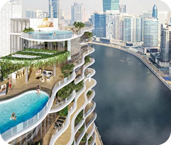 Chic Tower is located in the Business Bay area of Dubai, at the edge of the Dubai Canal.